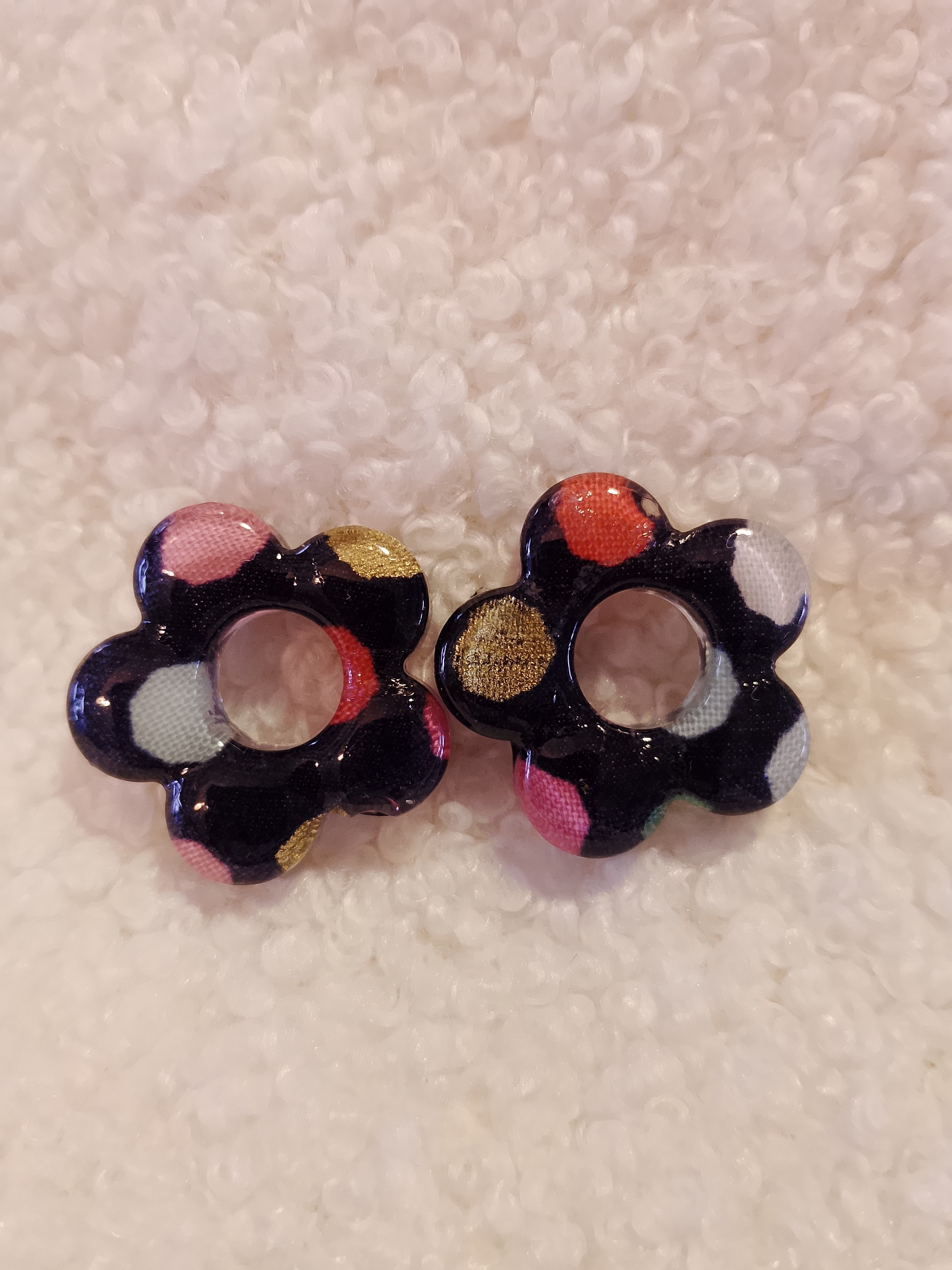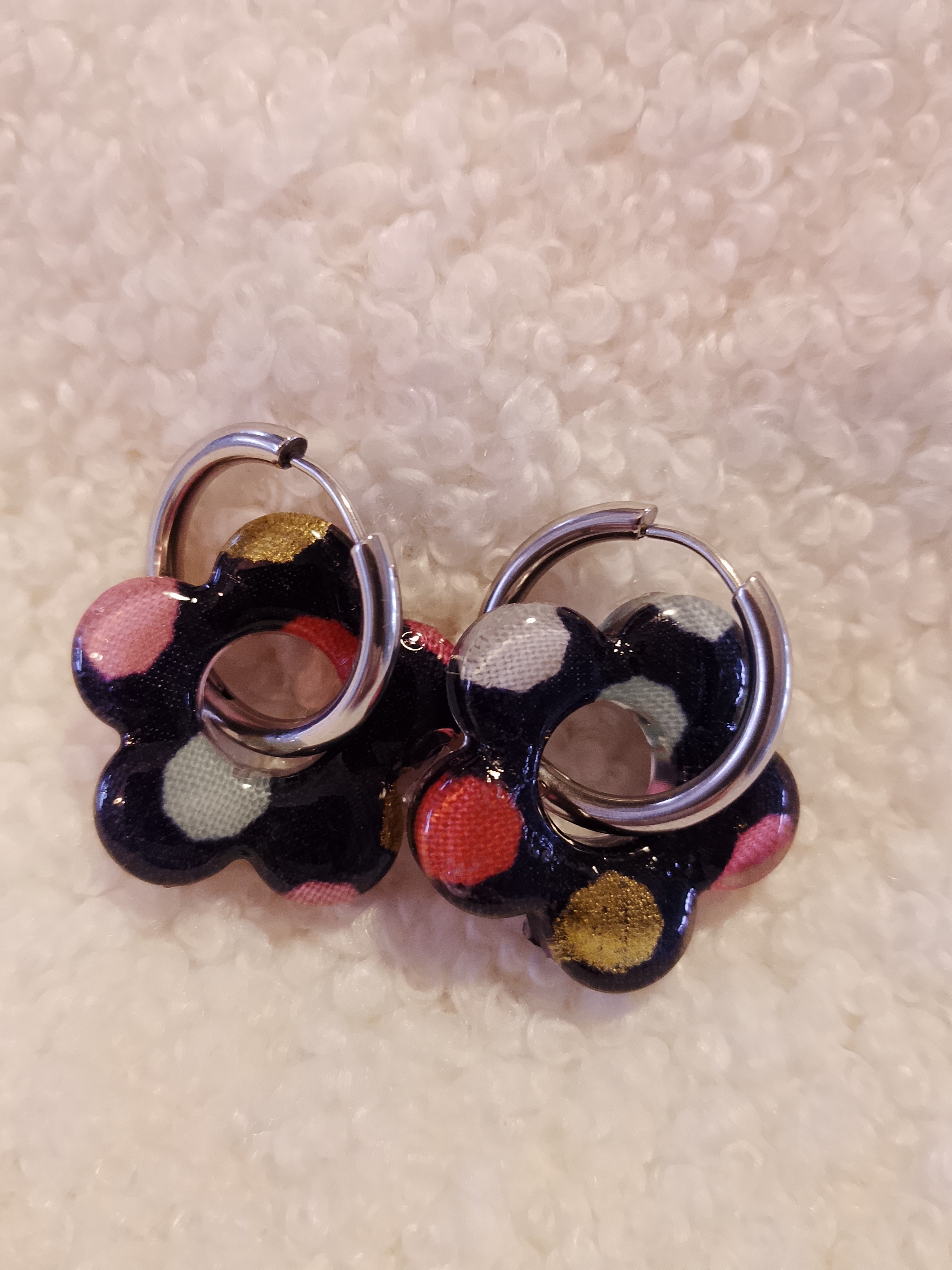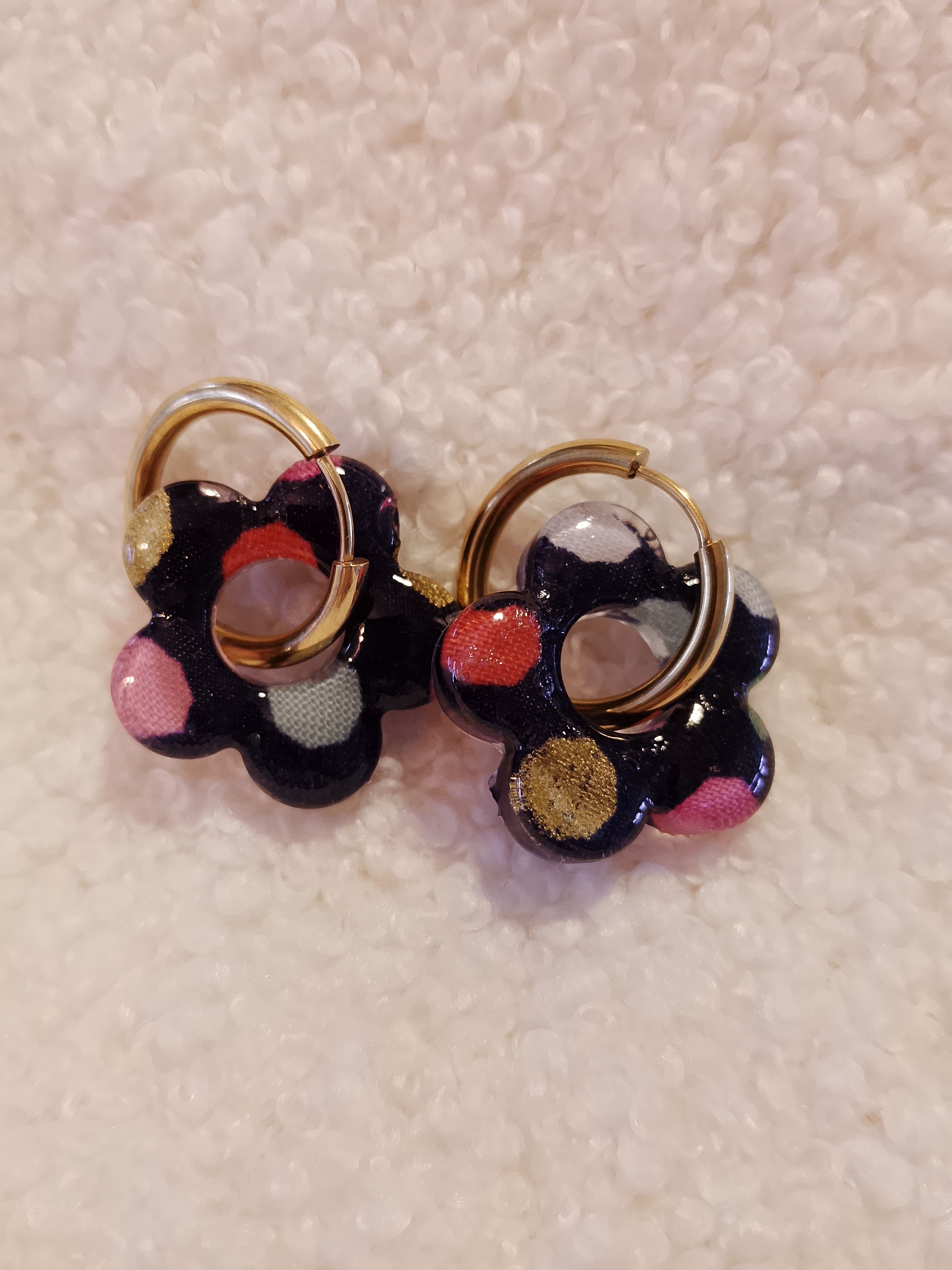 Dans un monde où les pampilles sont pour la plupart en résine, mes boucles d’oreilles se distinguent par une alliance unique de tissu et de résine.