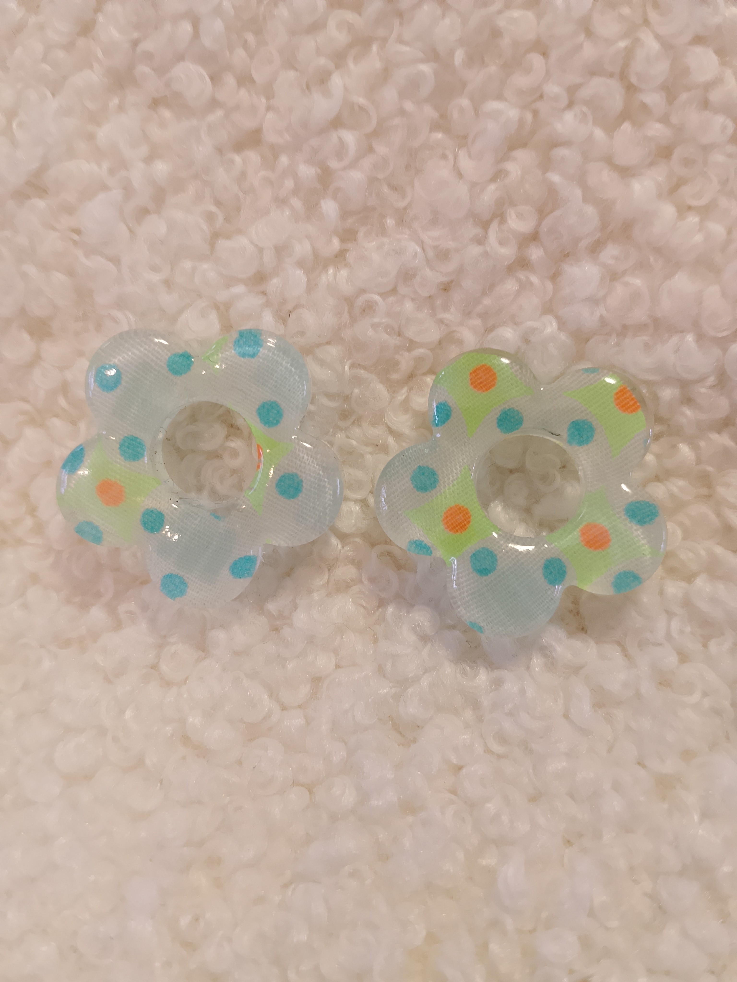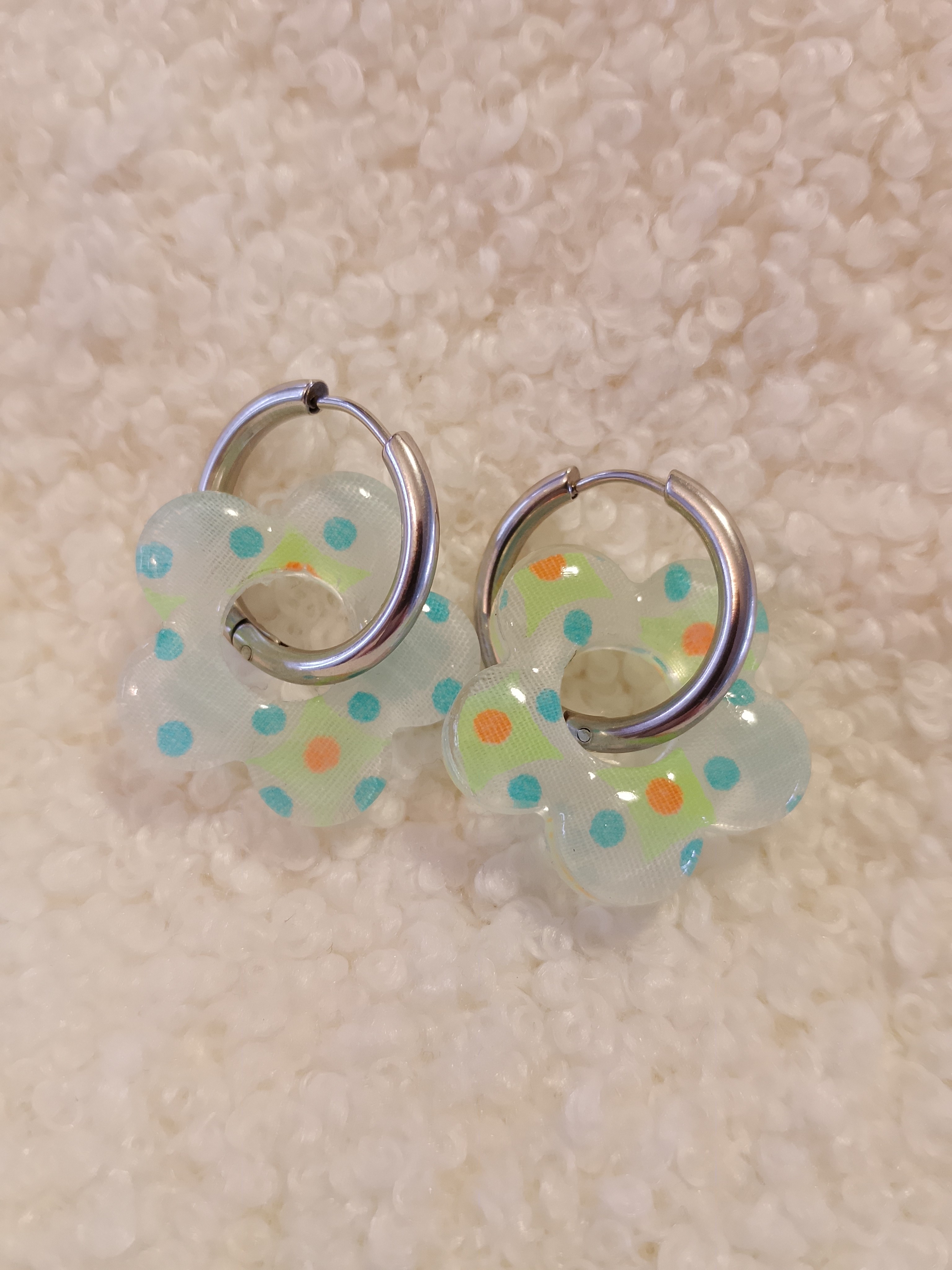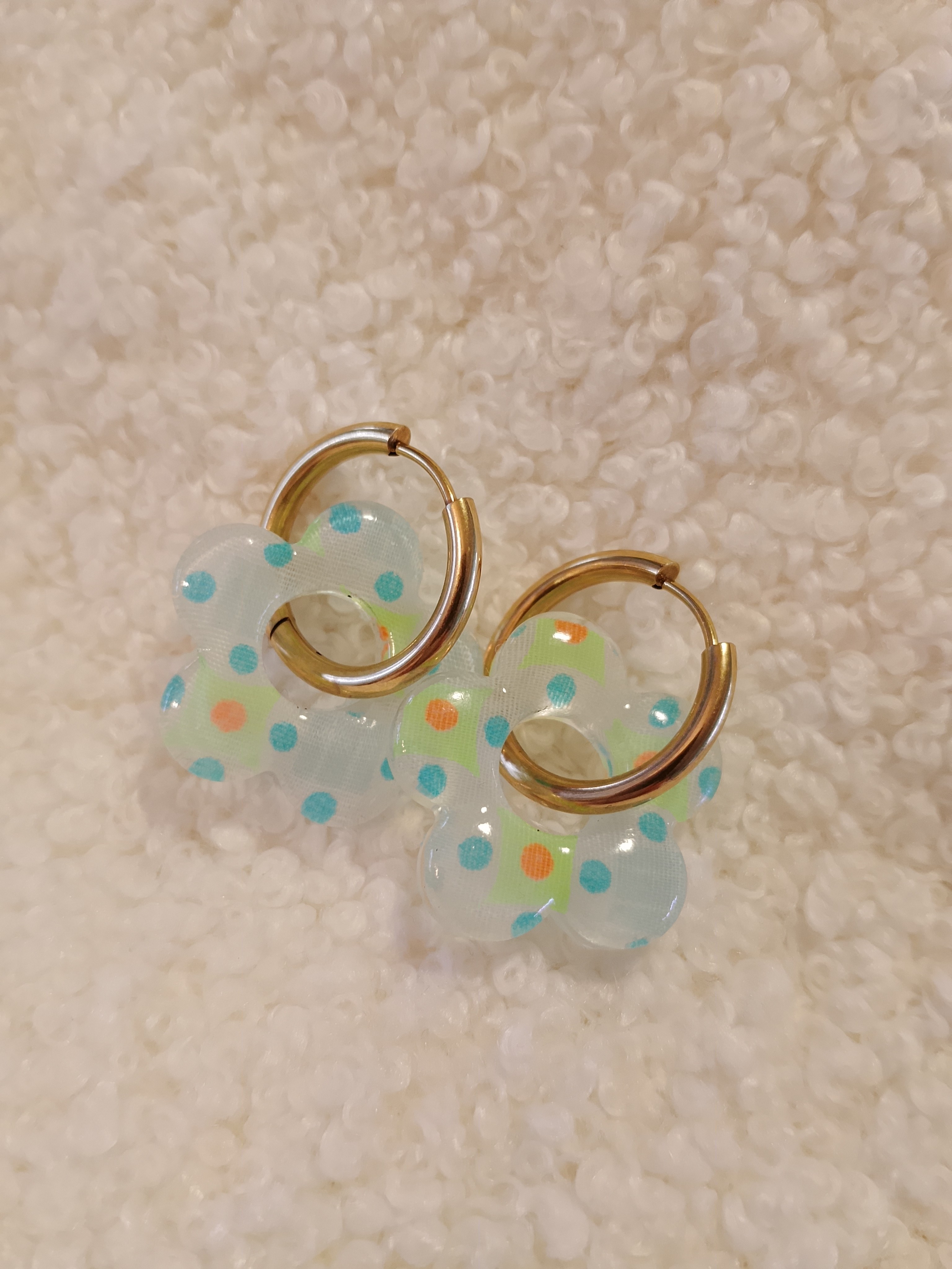 Dans un monde où les pampilles sont pour la plupart en résine, mes boucles d’oreilles se distinguent par une alliance unique de tissu et de résine.