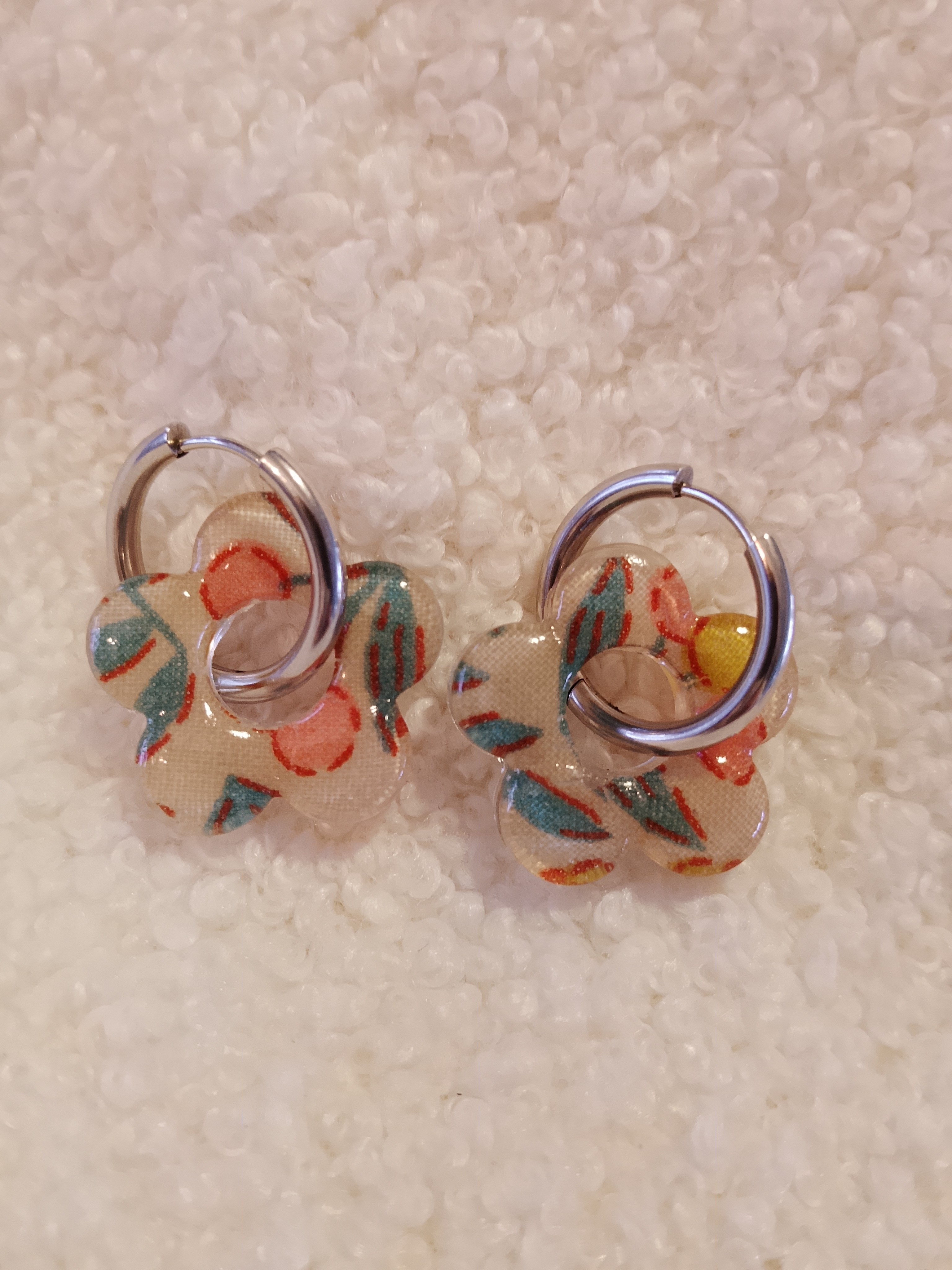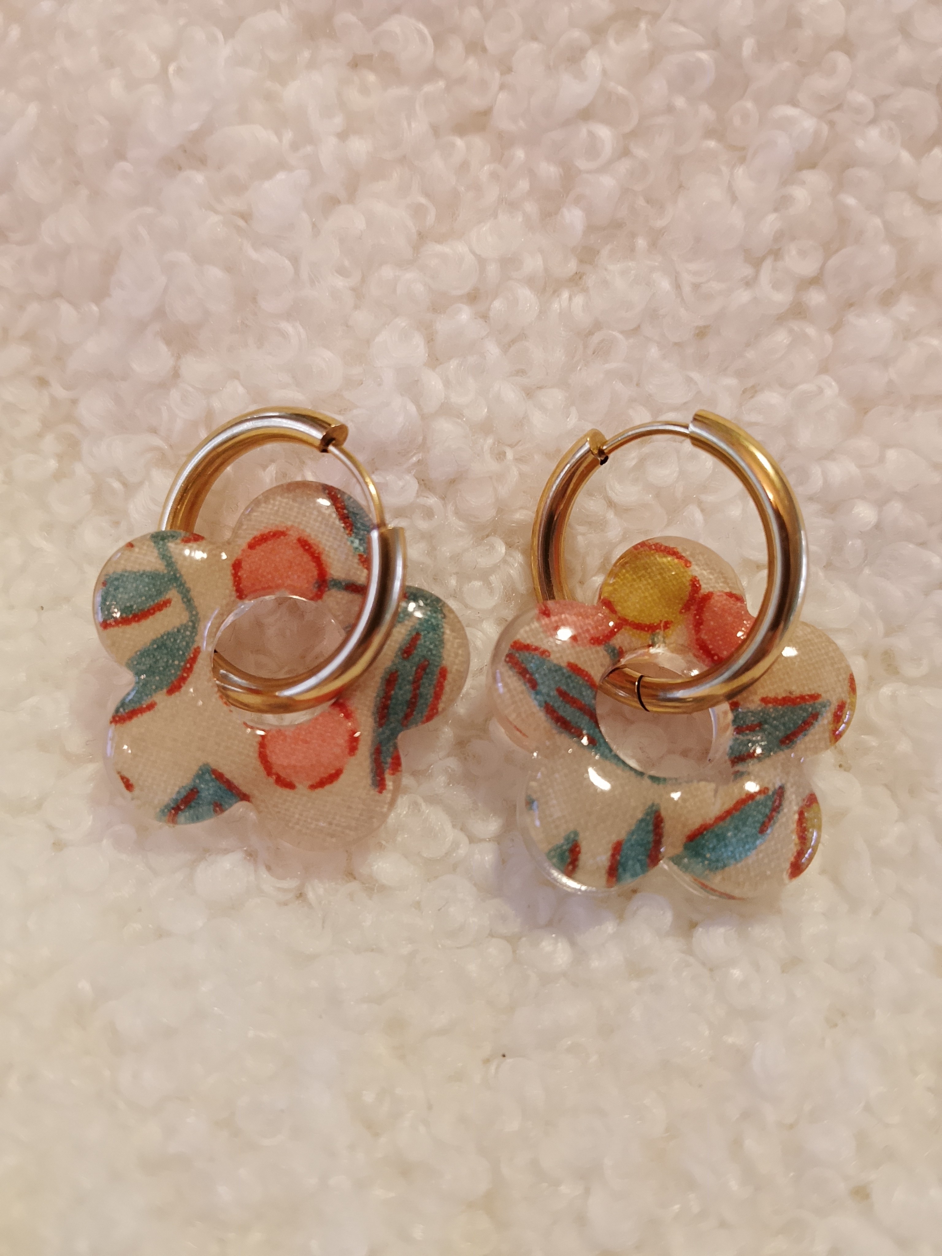 Dans un monde où les pampilles sont pour la plupart en résine, mes boucles d’oreilles se distinguent par une alliance unique de tissu et de résine.