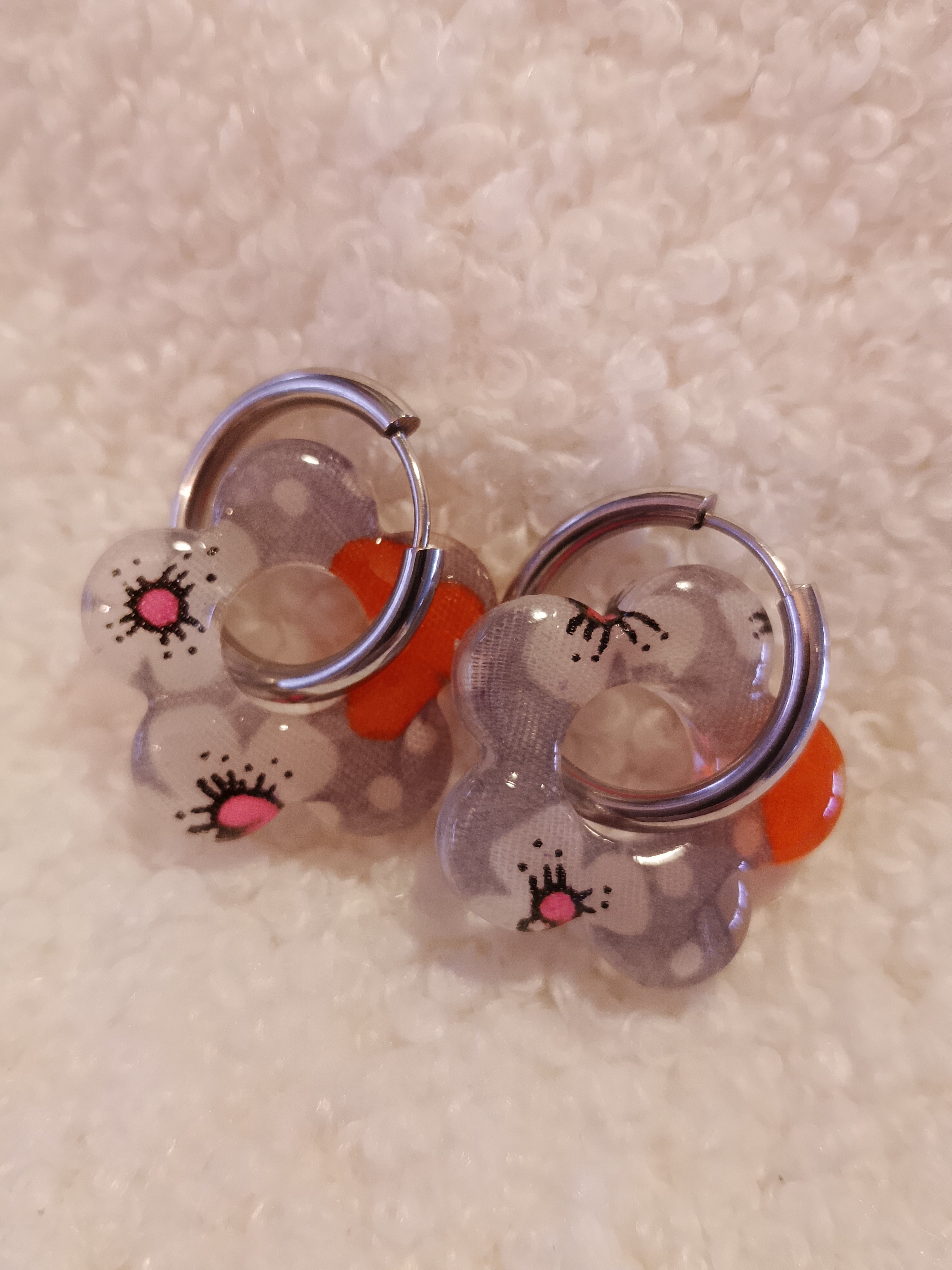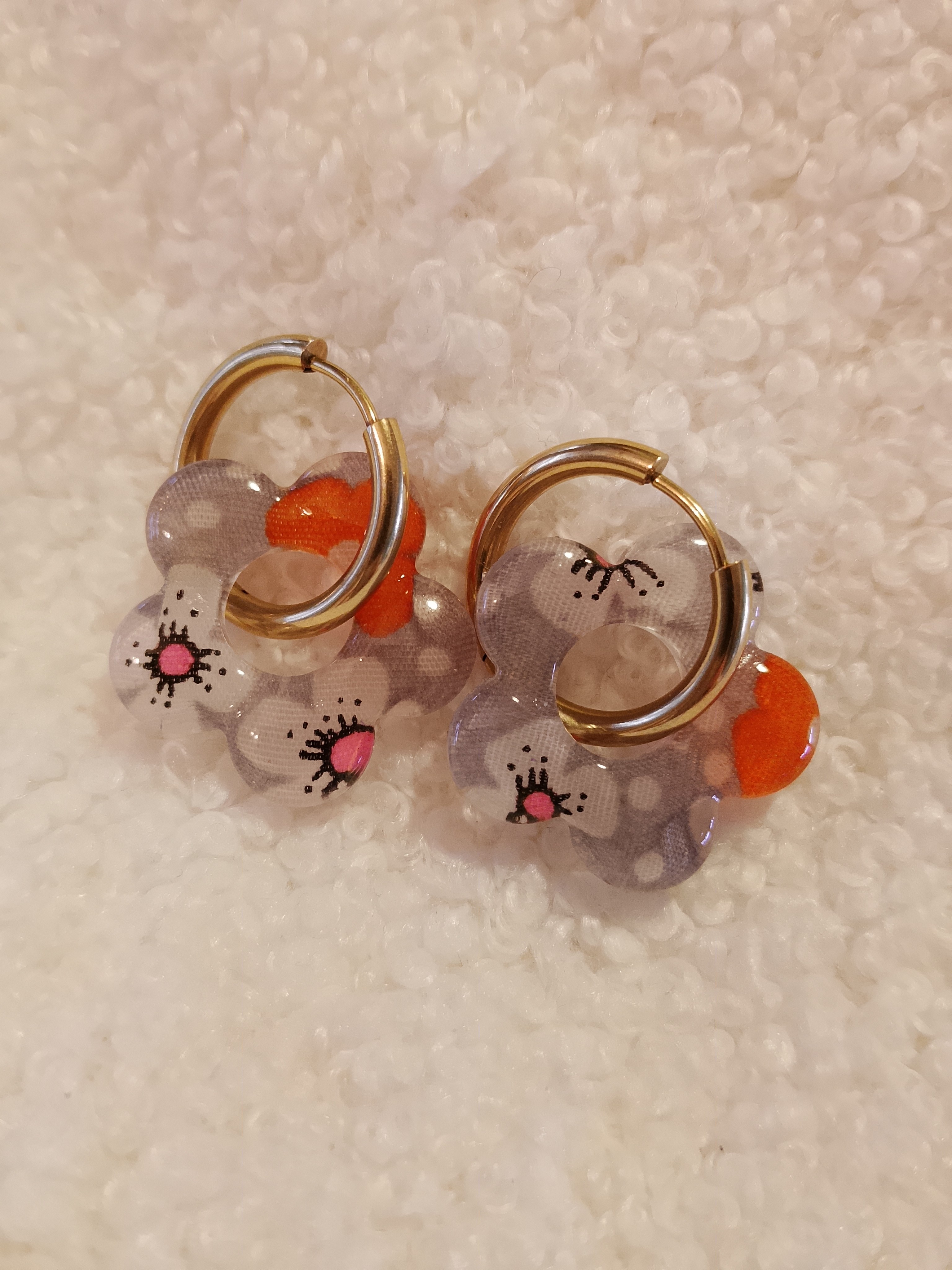 Dans un monde où les pampilles sont pour la plupart en résine, mes boucles d’oreilles se distinguent par une alliance unique de tissu et de résine.