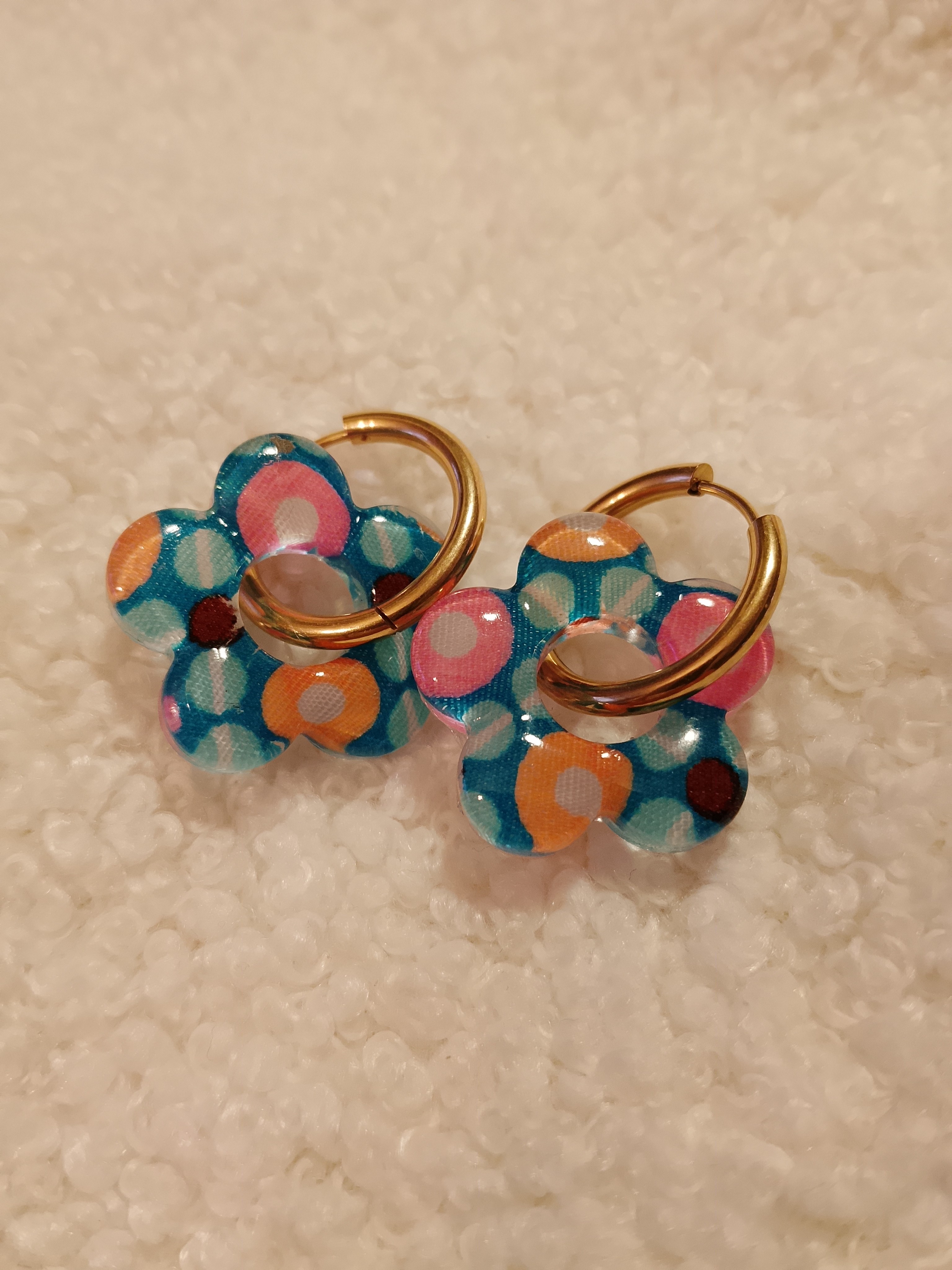 Dans un monde où les pampilles sont pour la plupart en résine, mes boucles d’oreilles se distinguent par une alliance unique de tissu et de résine.