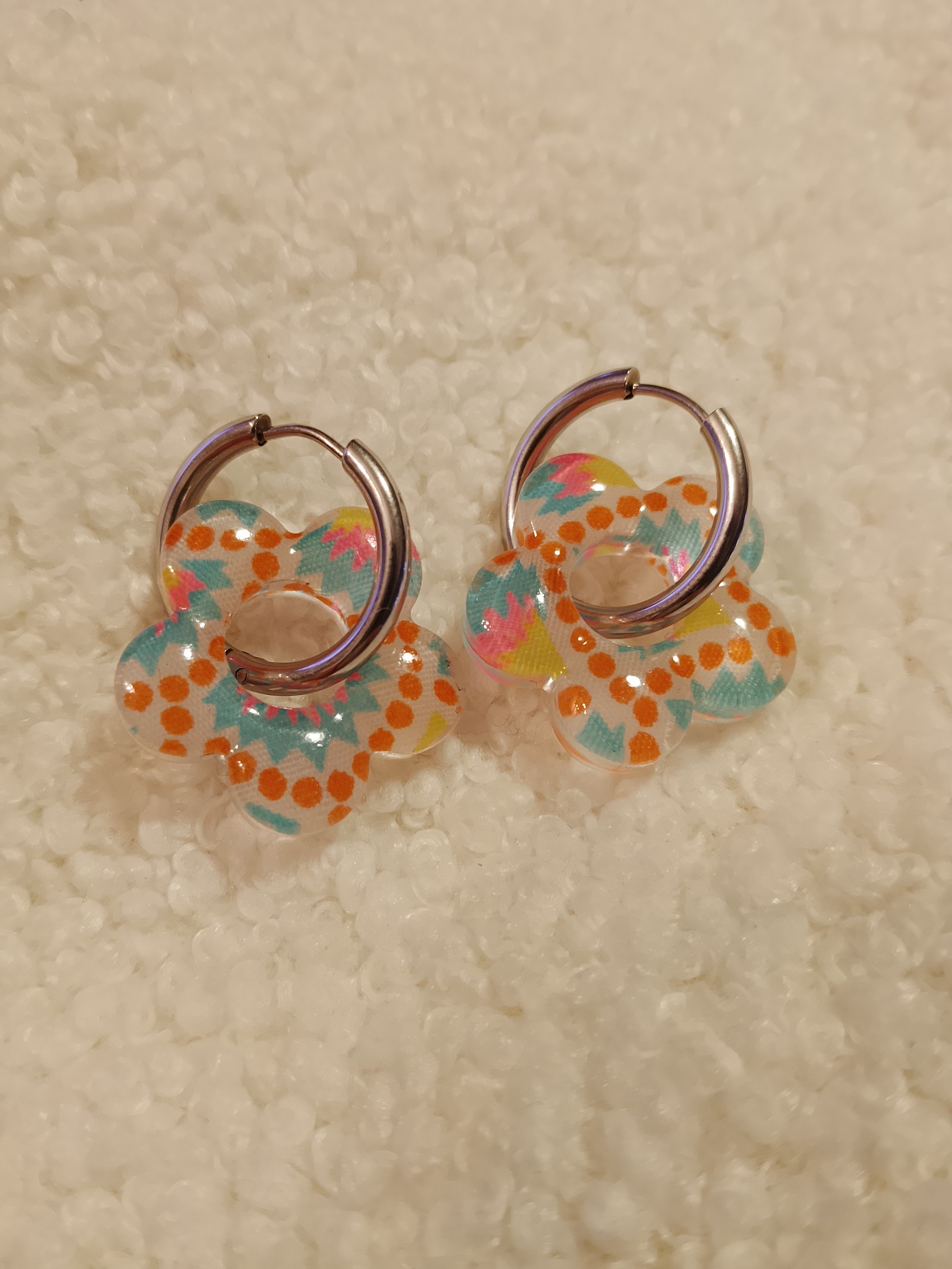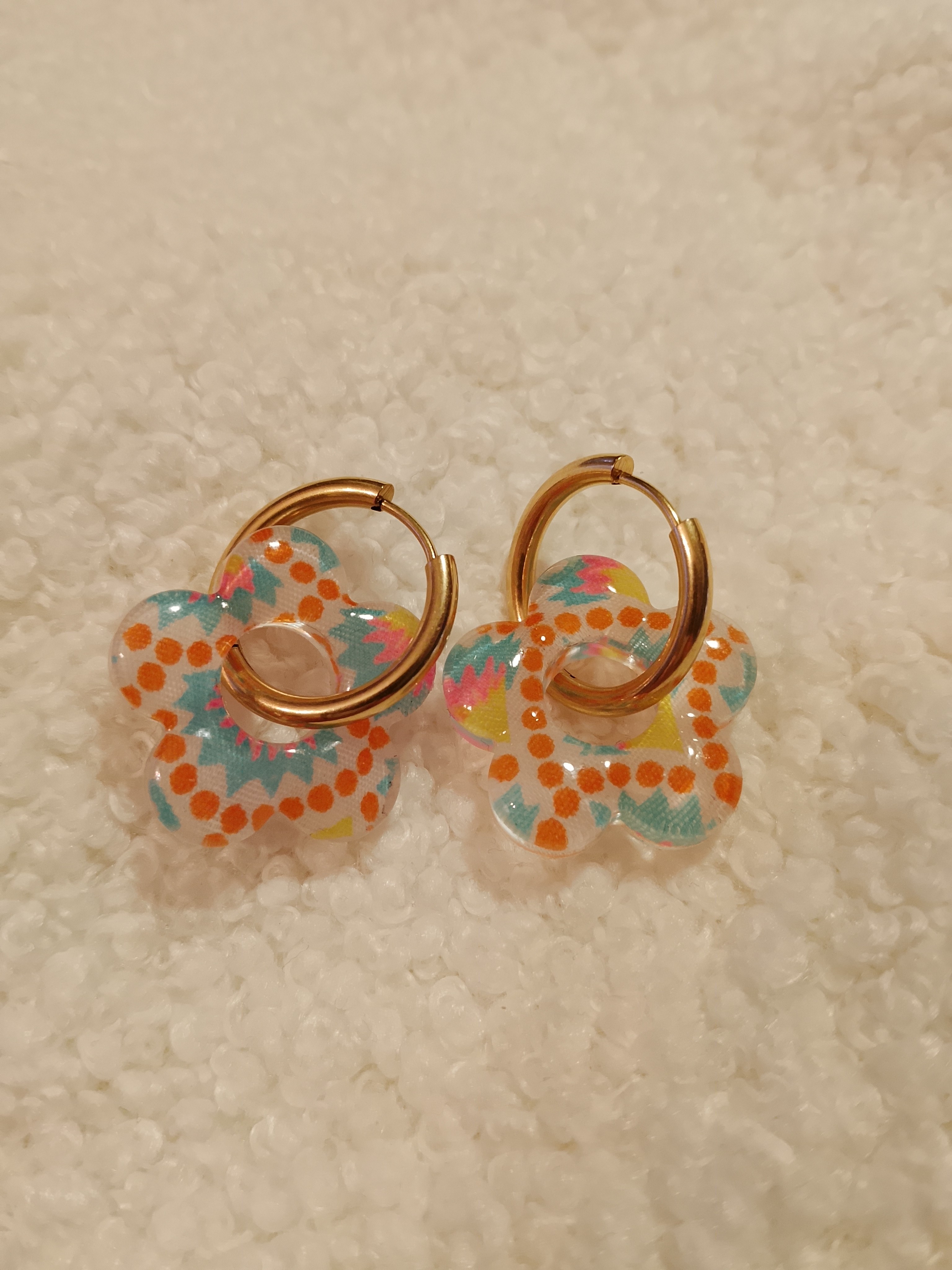 Dans un monde où les pampilles sont pour la plupart en résine, mes boucles d’oreilles se distinguent par une alliance unique de tissu et de résine.